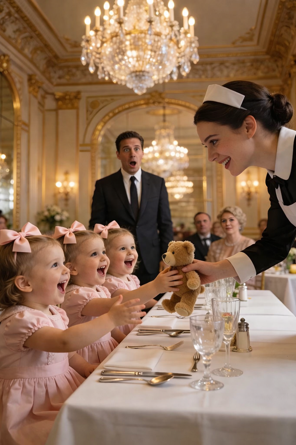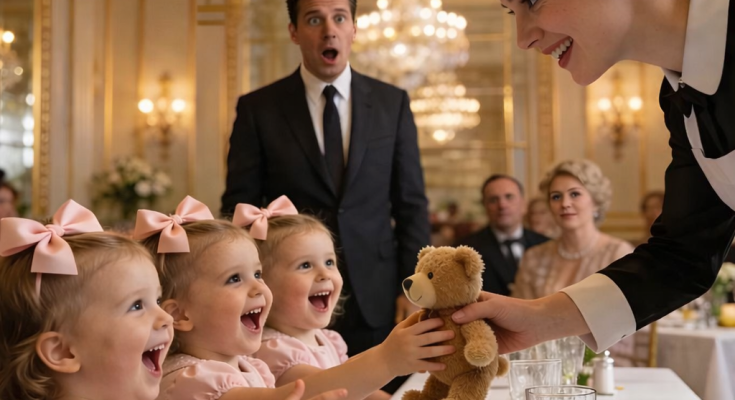 Emily approached with menus, keeping her voice gentle. The triplets didn’t respond. Their hands stayed tucked under the table, fingers clenched as if holding on to invisible strings. Daniel offered a polite smile that didn’t quite reach his eyes.