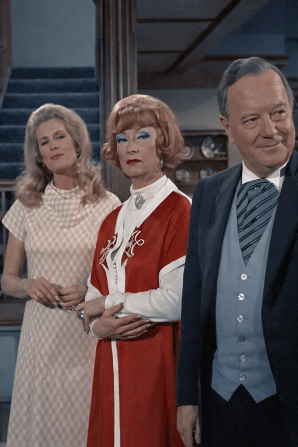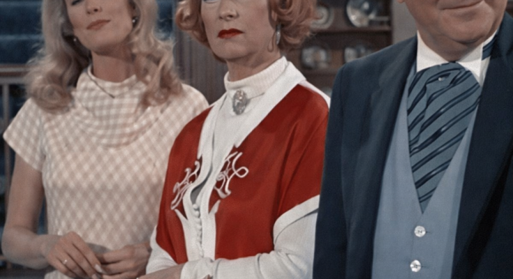 The Reality: Bewitched was filmed on a busy soundstage with a full crew standing just out of the camera’s view. In these unedited stills, we are simply seeing the shadows of boom operators and lighting technicians. What looks like a “secret” is actually just the reality of 1960s television production caught in a candid moment.