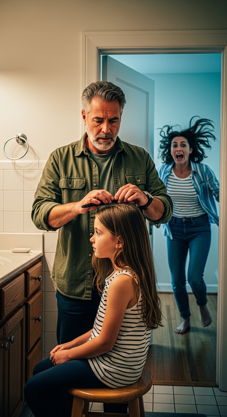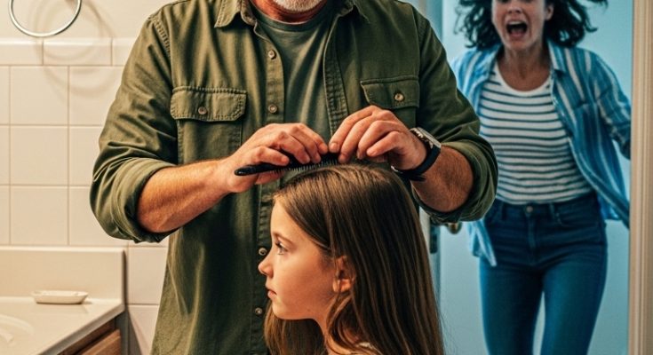 Quickly, I dashed into the bathroom and found Marcus frozen in place, a brush clutched in one hand while the other cautiously raised a small section of Lily’s hair. His face had drained of color, the same pale look he had worn since the tragic news of his father’s heart attack three years prior.