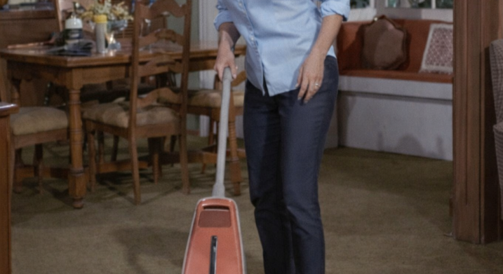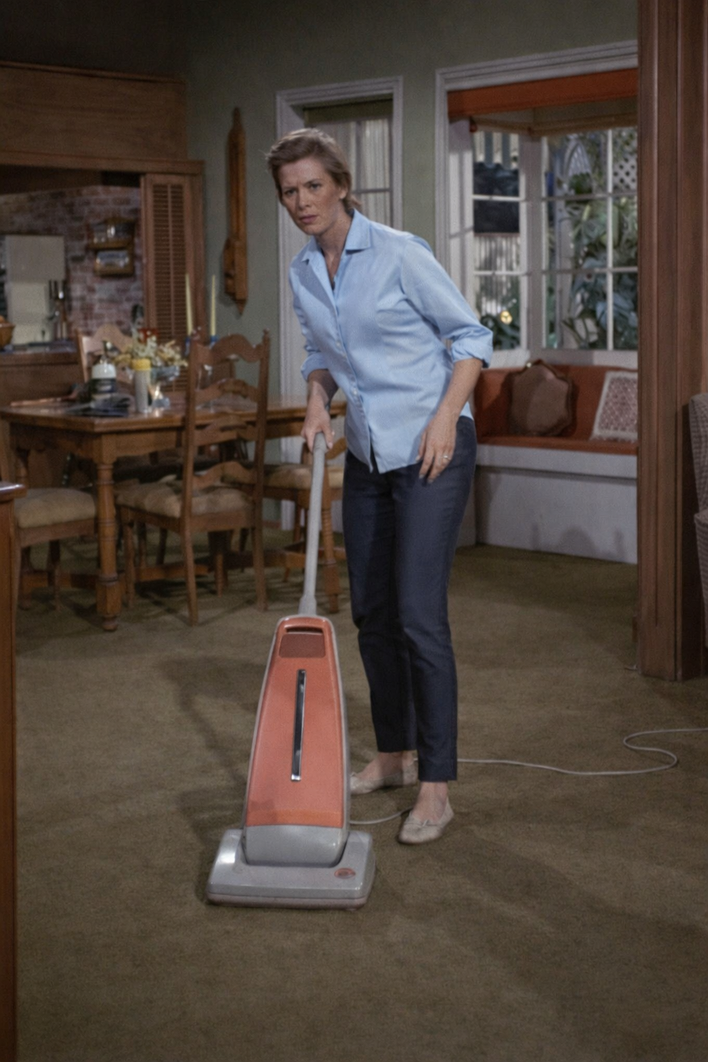 At first glance, this looks like a simple, everyday moment from a 1960s television show. A woman vacuums the living room, surrounded by tidy furniture, soft lighting, and the kind of clean, staged environment that defined many shows of that era.