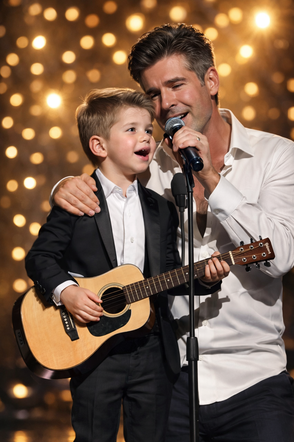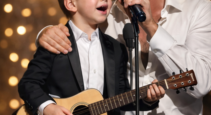 He stood there—barely tall enough to reach the microphone—wearing a little black button-up, jeans that bunched at the ankles, and cowboy boots that looked like they belonged to someone twice his size. He didn’t smile. He didn’t wave. He just stood quietly, gripping the mic with both hands like it was the only thing holding him to the earth.