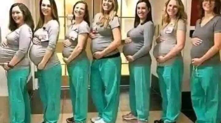 At first glance, all seven women in the picture seem to be expecting. They are all standing in similar postures, with hands resting on their bellies, giving the impression of pregnancy. However, upon closer inspection, subtle clues reveal that one of them is just pretending.