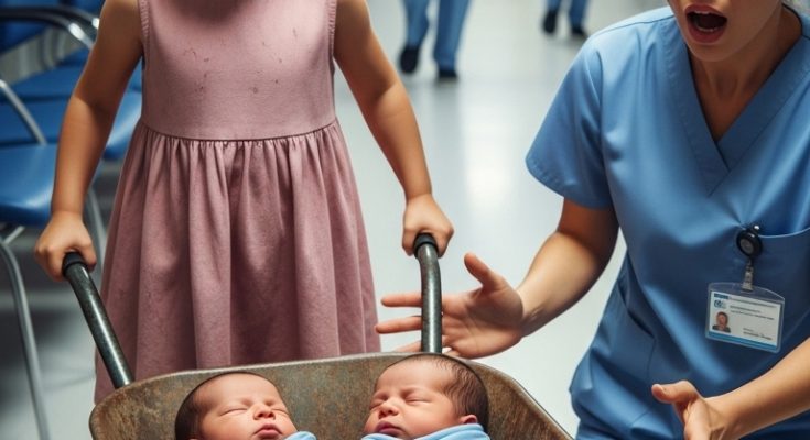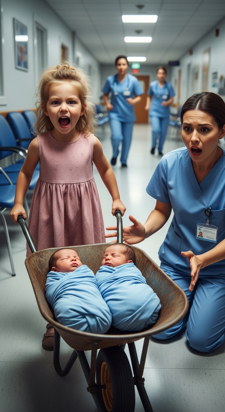 A little girl, no older than seven, stood barefoot on the polished tile, her feet cracked and streaked with dried blood, her thin summer dress stiff with dust, both hands gripping the splintered wooden handles of a rusted wheelbarrow that looked as though it had been salvaged from a scrapyard. Her knuckles were blistered and raw. Her lips were pale from dehydration. And inside the wheelbarrow, wrapped in a yellowed sheet that might once have been cheerful, lay two newborn infants who were so still they seemed carved from wax.