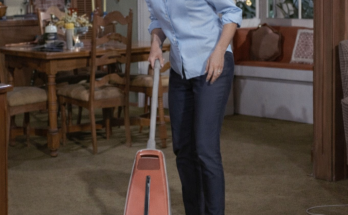 At first glance, this looks like a simple, everyday moment from a 1960s television show. A woman vacuums the living room, surrounded by tidy furniture, soft lighting, and the kind …